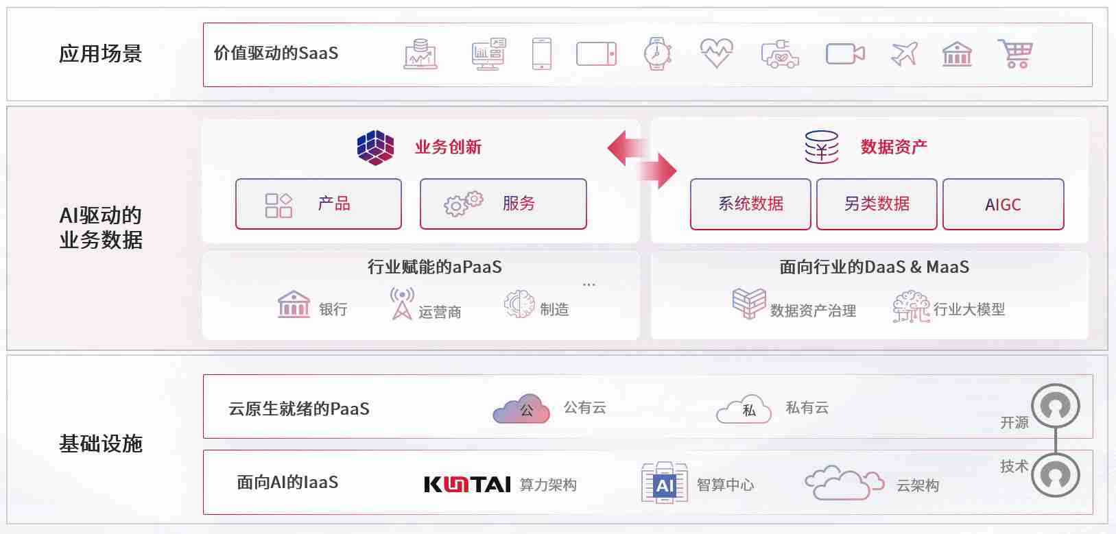 数字时代,,围绕企业数字化转型的关键要素,,,,壹号娱乐数码开创性的提出数云融合战略和技术体系框架,,,,着力在云原生、、数字原生、、AI原生和信创产业上架构产品和服务能力,,,,为处在不同数字化转型阶段的快消零售、、汽车、、、、金融、、、、医疗、、、政企、、、教育、、运营商等行业客户提供泛在的敏捷IT能力和融合的数据驱动能力,,,构建跨界融合创新的数字业务场景和新业务模式,,,助力企业级客户建立面向未来的核心能力和竞争优势,,,,全面推动社会的数字化、、、智能化转型升级。。。。