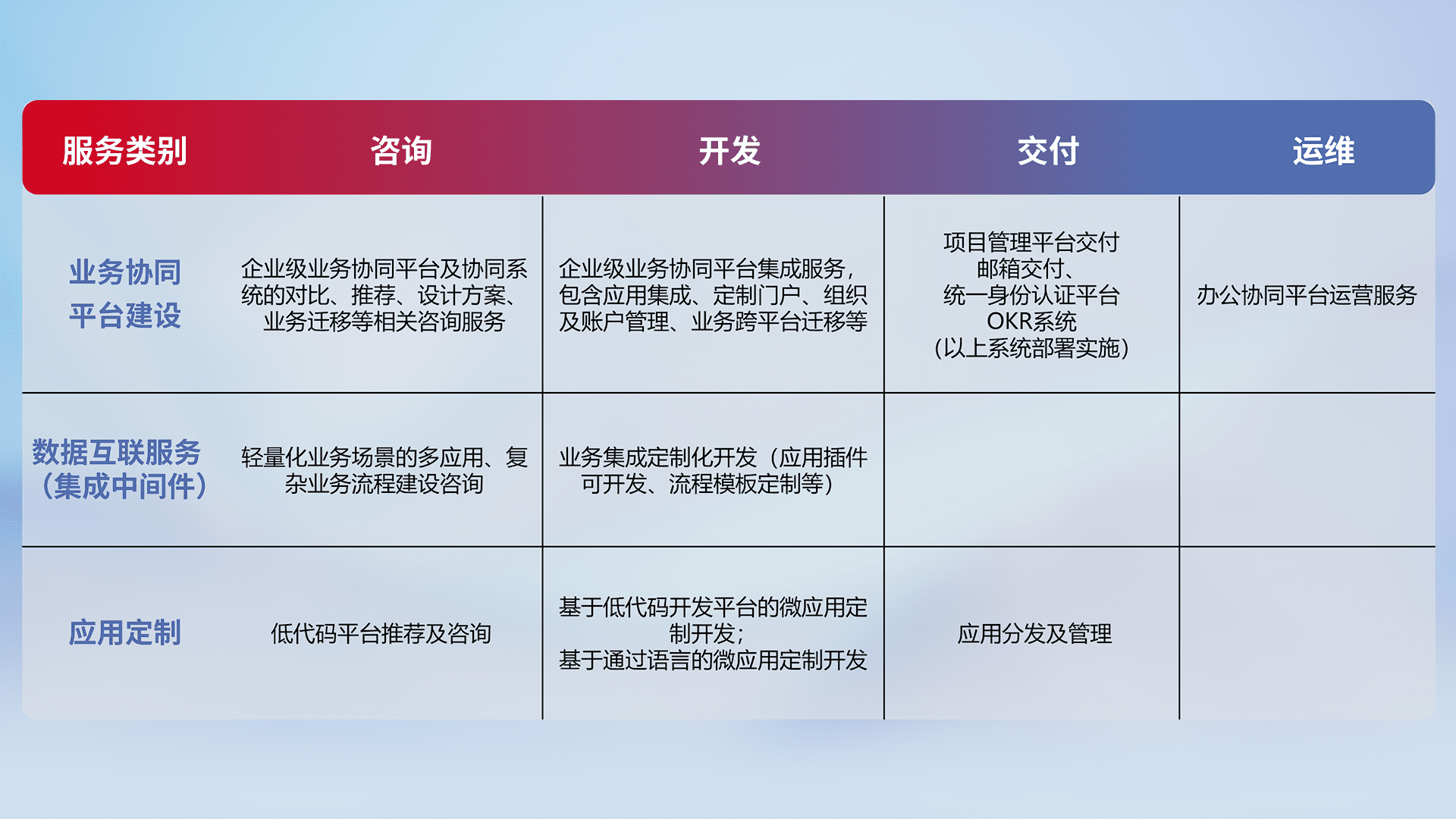 针对钉钉、、、企微、、、IDaas等平台级产品提供产品的规划、、、方案、、交付、、、、定制化开发等服务,,,实现如统一协同办公、、、、智能客户服务、、、混合会议管理、、智能数据查询、、等业务场景,,,,实现数字化转型。。。。